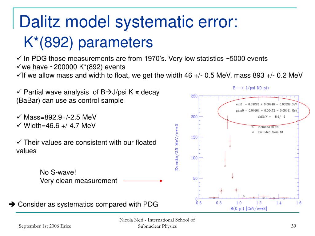 Dalitz model systematic error:K*(892) parameters • In PDG those measurements are from 1970’s. Very low statistics ~5000 events • we have ~200000 K*(892) events • If we allow mass and width to float, we get the width 46 +/- 0.5 MeV, mass 893 +/- 0.2 MeV • Partial wave analysis of BJ/psi K p decay (BaBar) can use as control sample • Mass=892.9+/-2.5 MeV • Width=46.6 +/-4.7 MeV • Their values are consistent with our floatedvalues No S-wave! Very clean measurement Consider as systematics compared with PDG Nicola Neri - International School of Subnuclear Physics