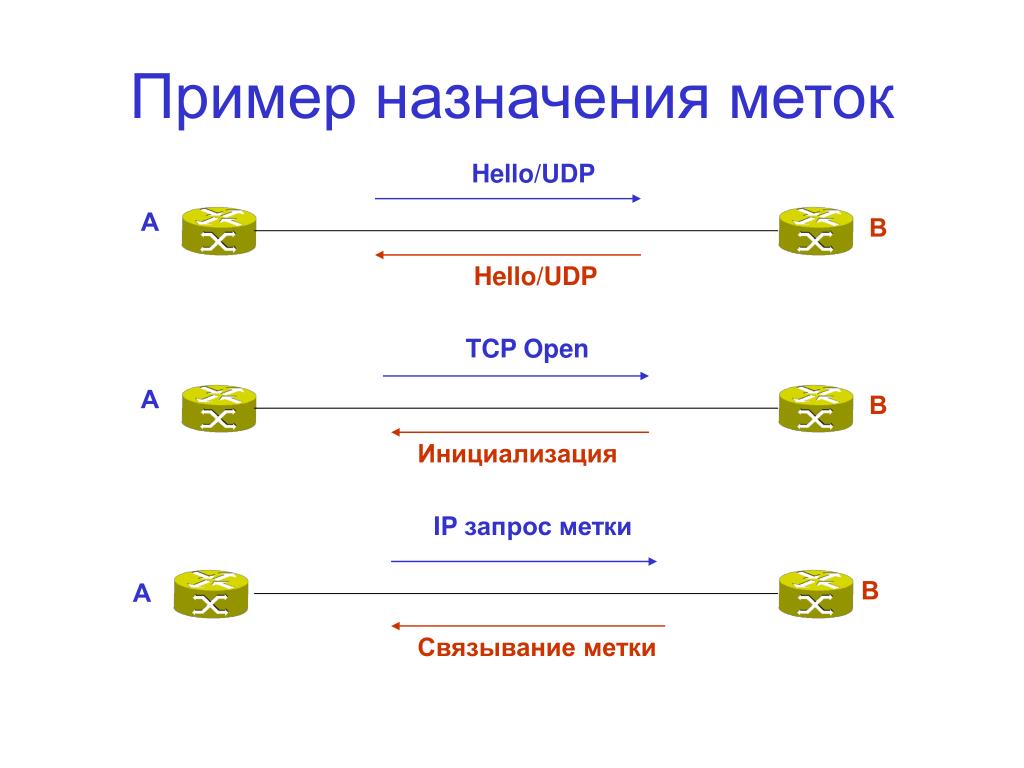 Пример назначения меток Hello/UDP А В Hello/UDP TCP Open А В Инициализация IP запрос метки В А Связывание метки
