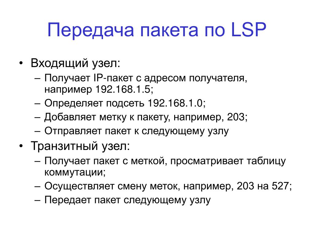 Передача пакета по LSP • Входящий узел: • Получает IP-пакет с адресом получателя, например 192.168.1.5; • Определяет подсеть 192.168.1.0; • Добавляет метку к пакету, например, 203; • Отправляет пакет к следующему узлу • Транзитный узел: • Получает пакет с меткой, просматривает таблицу коммутации; • Осуществляет смену меток, например, 203 на 527; • Передает пакет следующему узлу