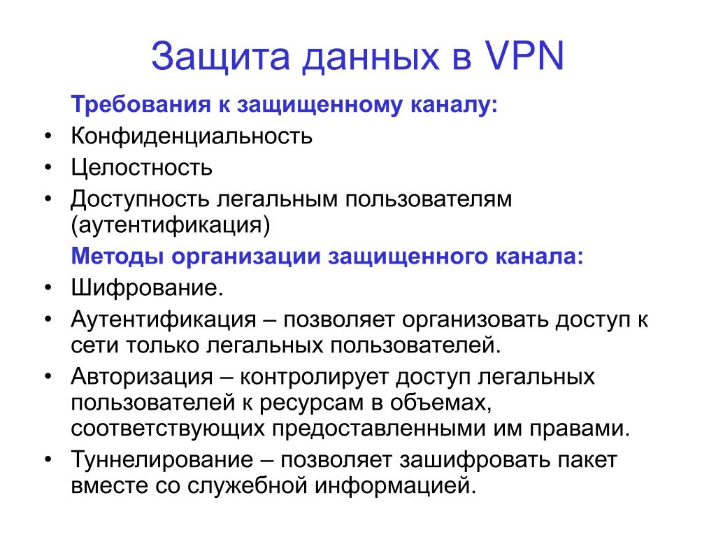 Защита данных в VPN Требования к защищенному каналу: • Конфиденциальность • Целостность • Доступность легальным пользователям (аутентификация) Методы организации защищенного канала: • Шифрование. • Аутентификация – позволяет организовать доступ к сети только легальных пользователей. • Авторизация – контролирует доступ легальных пользователей к ресурсам в объемах, соответствующих предоставленными им правами. • Туннелирование – позволяет зашифровать пакет вместе со служебной информацией.