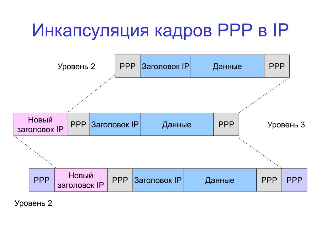Инкапсуляция кадров РРР в IP PPP Заголовок IP Данные PPP Уровень 2 Новый заголовок IP PPP Заголовок IP Данные PPP Уровень 3 PPP Новый заголовок IP PPP Заголовок IP Данные PPP PPP Уровень 2