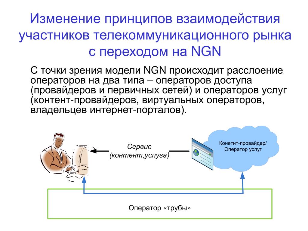 Изменение принципов взаимодействия участников телекоммуникационного рынка с переходом на NGN С точки зрения модели NGN происходит расслоение операторов на два типа – операторов доступа (провайдеров и первичных сетей) и операторов услуг (контент-провайдеров, виртуальных операторов, владельцев интернет-порталов).