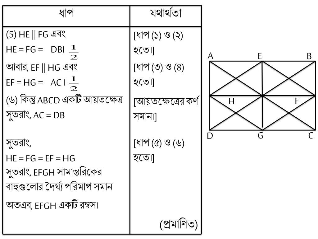 ধাপ যথার্থতা (5) HE || FG এবং HE = FG = DB। [ধাপ (১) ও (২) হতে।] A E B আবার, EF || HG এবং EF = HG = AC । [ধাপ (৩) ও (৪) হতে।] (৬) কিন্তু ABCD একটি আয়তক্ষেত্র সু্তরাং, AC = DB F H [আয়তক্ষেত্রের কর্ণ সমান।] G C D সু্তরাং, HE = FG = EF = HG [ধাপ (৫) ও (৬) হতে।] সু্তরাং, EFGH সামান্তরিকের বাহুগুলোর দৈর্ঘ্য পরিমাপ সমান অতএব, EFGH একটি রম্বস। (প্রমাণিত)