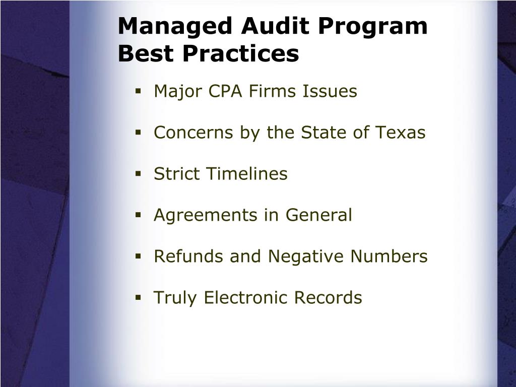 Managed Audit Program Best Practices • Major CPA Firms Issues • Concerns by the State of Texas • Strict Timelines • Agreements in General • Refunds and Negative Numbers • Truly Electronic Records