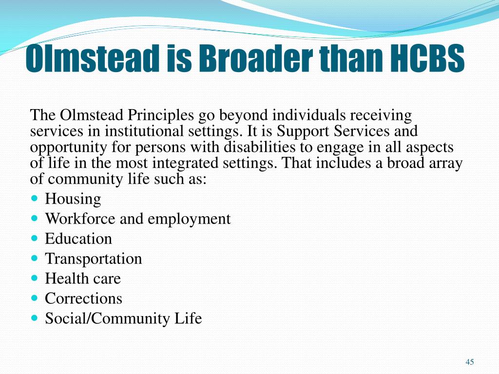 Olmstead is Broader than HCBS The Olmstead Principles go beyond individuals receiving services in institutional settings. It is Support Services and opportunity for persons with disabilities to engage in all aspects of life in the most integrated settings. That includes a broad array of community life such as: • Housing • Workforce and employment • Education • Transportation • Health care • Corrections • Social/Community Life