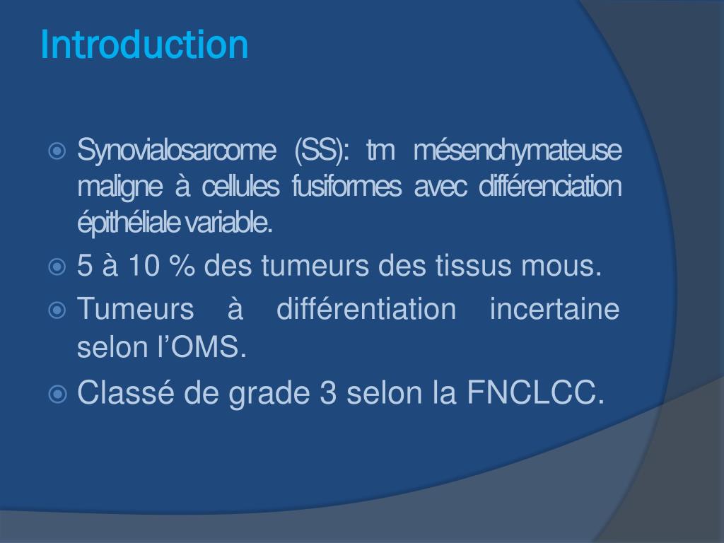 Introduction • Synovialosarcome(SS): tm mésenchymateuse maligne à cellules fusiformes avec différenciation épithéliale variable. • 5 à 10 % des tumeurs des tissus mous. • Tumeurs à différentiation incertaine selon l’OMS. • Classé de grade 3 selon la FNCLCC.