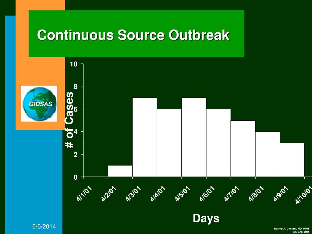 Continuous Source Outbreak 10 8 6 # of Cases 4 2 0 4/1/01 4/2/01 4/3/01 4/4/01 4/5/01 4/6/01 4/7/01 4/8/01 4/9/01 4/10/01 Days Rashid A. Chotani, MD, MPH GIDSAS-JHU