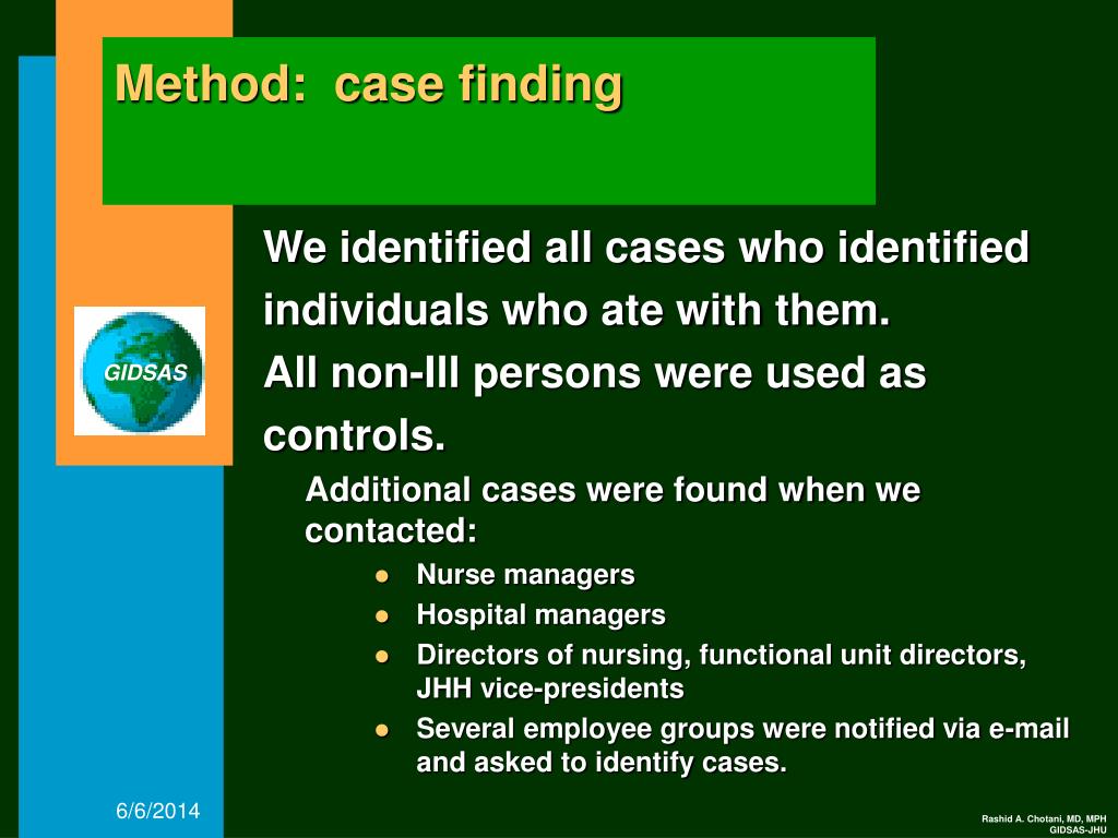 Method: case finding We identified all cases who identified individuals who ate with them. All non-Ill persons were used as controls. • Additional cases were found when we contacted: • Nurse managers • Hospital managers • Directors of nursing, functional unit directors, JHH vice-presidents • Several employee groups were notified via e-mail and asked to identify cases. Rashid A. Chotani, MD, MPH GIDSAS-JHU