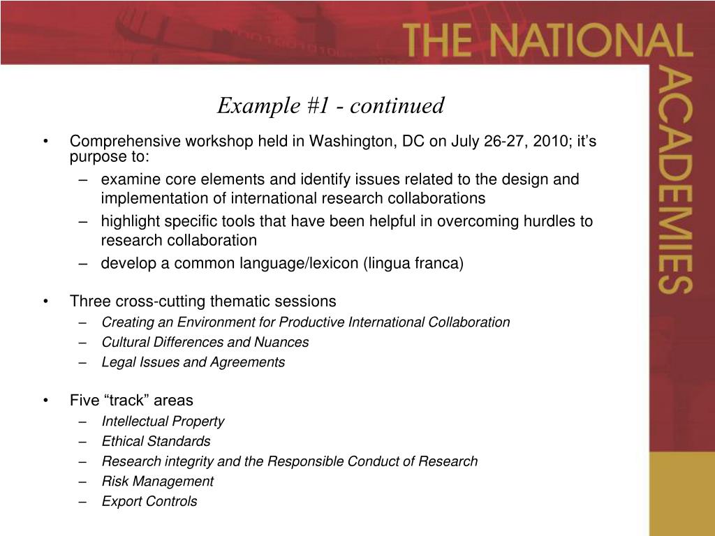 Example #1 - continued • Comprehensive workshop held in Washington, DC on July 26-27, 2010; it’s purpose to: • examine core elements and identify issues related to the design and implementation of international research collaborations • highlight specific tools that have been helpful in overcoming hurdles to research collaboration • develop a common language/lexicon (lingua franca) • Three cross-cutting thematic sessions • Creating an Environment for Productive International Collaboration • Cultural Differences and Nuances • Legal Issues and Agreements • Five “track” areas • Intellectual Property • Ethical Standards • Research integrity and the Responsible Conduct of Research • Risk Management • Export Controls