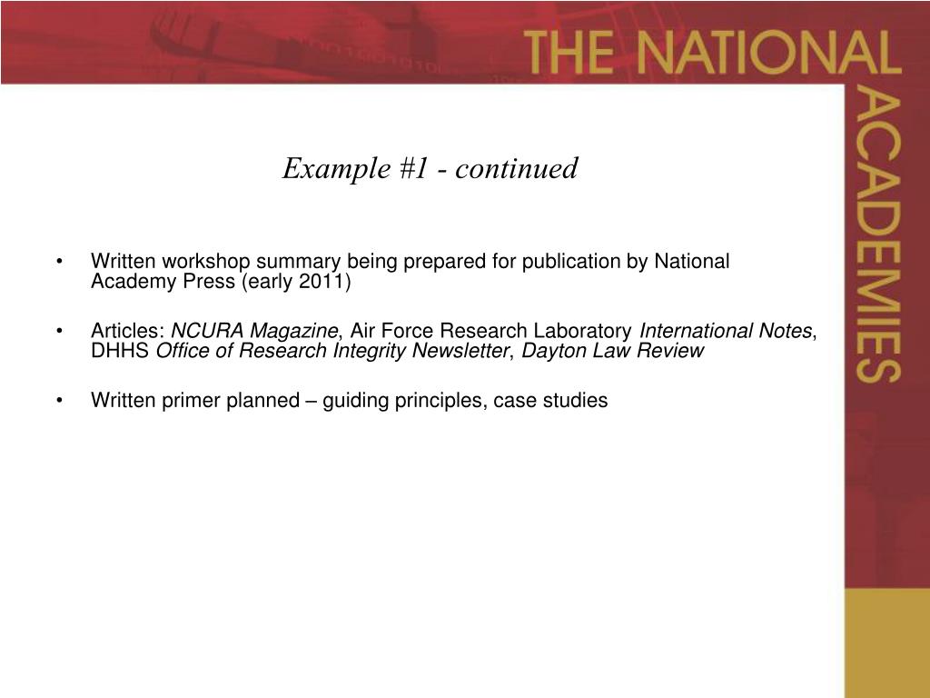 Example #1 - continued • Written workshop summary being prepared for publication by National Academy Press (early 2011) • Articles: NCURA Magazine, Air Force Research Laboratory International Notes, DHHS Office of Research Integrity Newsletter, Dayton Law Review • Written primer planned – guiding principles, case studies