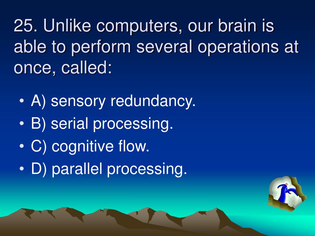 25. Unlike computers, our brain is able to perform several operations at once, called: • A) sensory redundancy. • B) serial processing. • C) cognitive flow. • D) parallel processing.