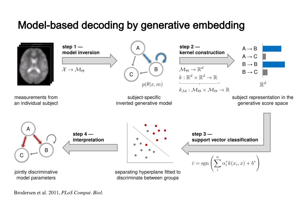 Model-based decoding by generative embedding A A step 1 — model inversion step 2 — kernel construction A → B A → C B → B B → C B B C C measurements from an individual subject subject-specificinverted generative model subject representation in the generative score space step 3 — support vector classification step 4 — interpretation jointly discriminative model parameters separating hyperplane fitted to discriminate between groups Brodersen et al. 2011, PLoS Comput. Biol.