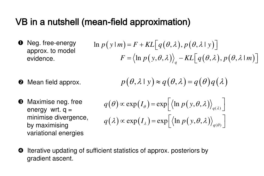 VB in a nutshell (mean-field approximation) Neg. free-energy approx. to model evidence. Mean field approx. Maximise neg. free energy wrt. q = minimise divergence, by maximisingvariational energies Iterative updating of sufficient statistics of approx. posteriors by gradient ascent.