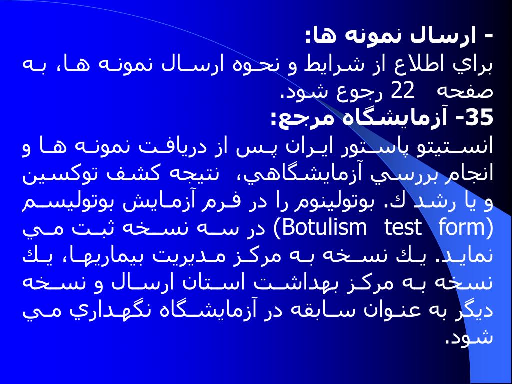 - ارسال نمونه ها: براي اطلاع از شرايط و نحوه ارسال نمونه ها، به صفحه 22 رجوع شود. 35- آزمايشگاه مرجع: انستیتو پاستور ایران پس از دريافت نمونه ها و انجام بررسي آزمايشگاهي، نتيجه كشف توكسين و يا رشد ك. بوتولينوم را در فرم آزمايش بوتوليسم (Botulism test form) در سه نسخه ثبت مي نمايد. يك نسخه به مركز مديريت بيماريها، يك نسخه به مركز بهداشت استان ارسال و نسخه ديگر به عنوان سابقه در آزمايشگاه نگهداري مي شود.