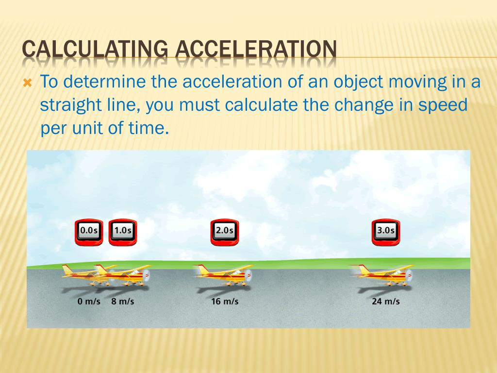 To determine the acceleration of an object moving in a straight line, you must calculate the change in speed per unit of time. Calculating Acceleration