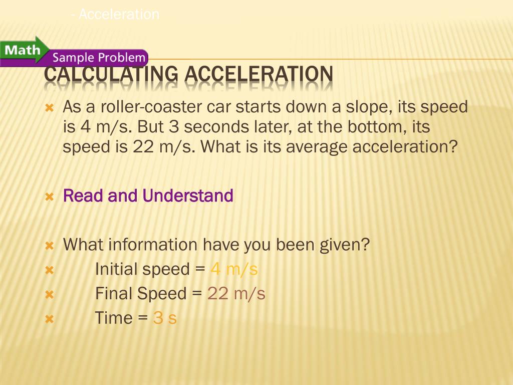 - Acceleration As a roller-coaster car starts down a slope, its speed is 4 m/s. But 3 seconds later, at the bottom, its speed is 22 m/s. What is its average acceleration? Read and Understand What information have you been given? Initial speed = 4 m/s Final Speed = 22 m/s Time = 3 s Calculating Acceleration