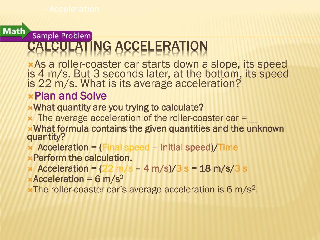 - Acceleration As a roller-coaster car starts down a slope, its speed is 4 m/s. But 3 seconds later, at the bottom, its speed is 22 m/s. What is its average acceleration? Plan and Solve What quantity are you trying to calculate? The average acceleration of the roller-coaster car = __ What formula contains the given quantities and the unknown quantity? Acceleration = (Final speed – Initial speed)/Time Perform the calculation. Acceleration = (22 m/s – 4 m/s)/3 s = 18 m/s/3s Acceleration = 6 m/s2 The roller-coaster car’s average acceleration is 6 m/s2. Calculating Acceleration