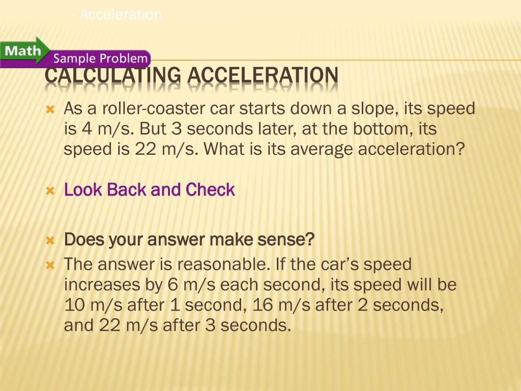 - Acceleration As a roller-coaster car starts down a slope, its speed is 4 m/s. But 3 seconds later, at the bottom, its speed is 22 m/s. What is its average acceleration? Look Back and Check Does your answer make sense? The answer is reasonable. If the car’s speed increases by 6 m/s each second, its speed will be 10 m/s after 1 second, 16 m/s after 2 seconds, and 22 m/s after 3 seconds. Calculating Acceleration