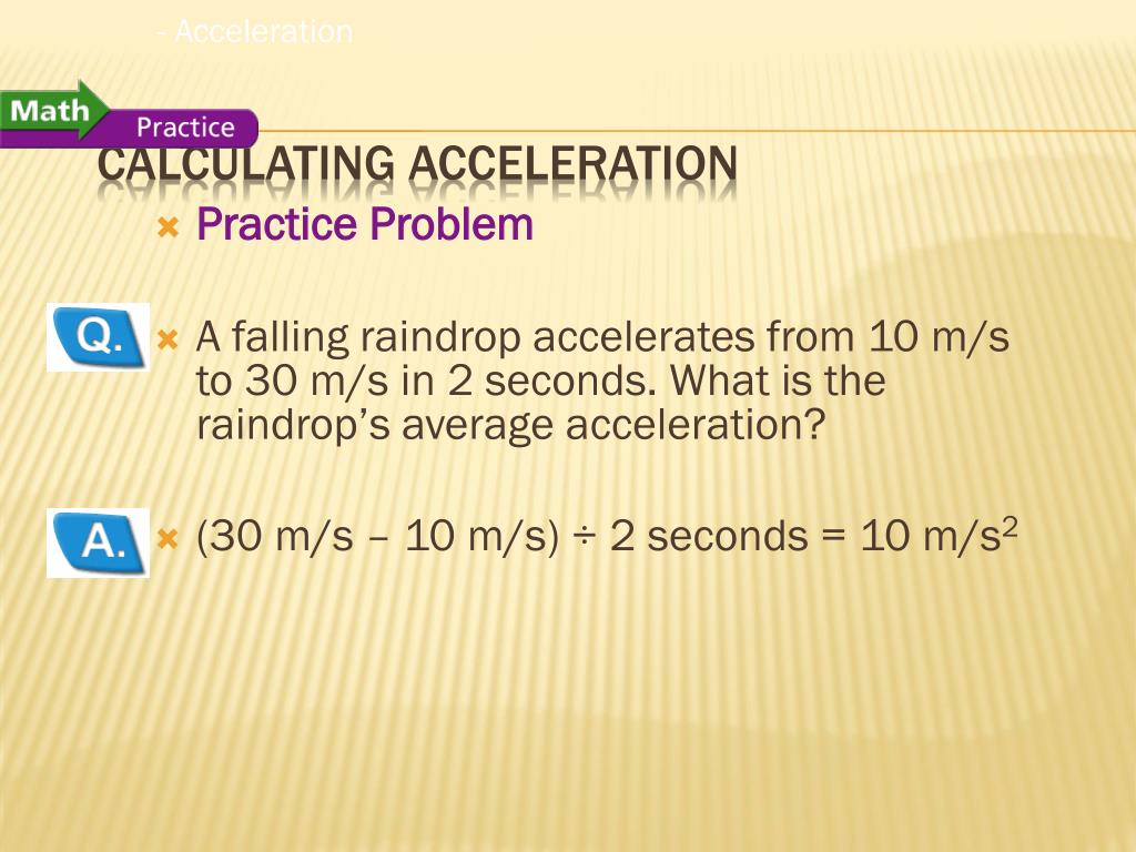 - Acceleration Calculating Acceleration • Practice Problem • A falling raindrop accelerates from 10 m/s to 30 m/s in 2 seconds. What is the raindrop’s average acceleration? • (30 m/s – 10 m/s) ÷ 2 seconds = 10 m/s2