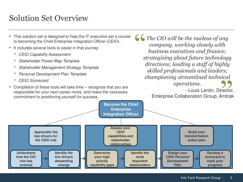 Solution Set Overview • This solution set is designed to help the IT executive set a course to becoming the Chief Enterprise Integration Officer (CEIO). • It includes several tools to assist in that journey: • CEIO Capability Assessment • Stakeholder Power Map Template • Stakeholder Management Strategy Template • Personal Development Plan Template • CEIO Scorecard • Completion of these tools will take time – recognize that you are responsible for your next career move, and make the necessary commitment to positioning yourself for success. The CIO will be the nucleus of any company, working closely with business executives and finance; strategizing about future technology directions; leading a staff of highly skilled professionals and leaders; championing streamlined technical operations. - Louis Lantin, Director, Enterprise Collaboration Group, Amtrak Become the Chief Enterprise Integration Officer Appreciate the key drivers for the CEIO role Assess your CEIO capabilities and stakeholder relationships Build your transformation action plan Identify the five drivers demanding change Determine your high priority capability gaps Understand how the CIO role has evolved Identify the most important stakeholders Design your CEIO Personal Development Plan Develop a scorecard to track your progress