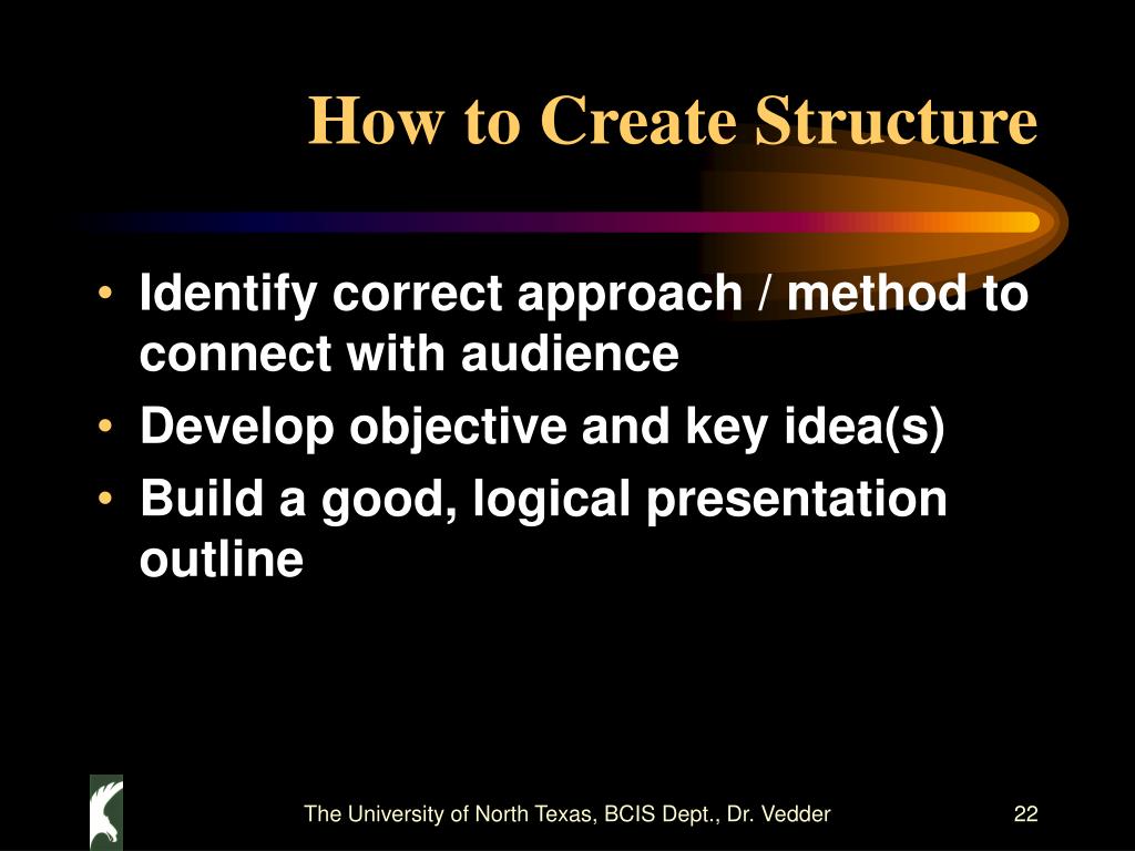 How to Create Structure • Identify correct approach / method to connect with audience • Develop objective and key idea(s) • Build a good, logical presentation outline The University of North Texas, BCIS Dept., Dr. Vedder
