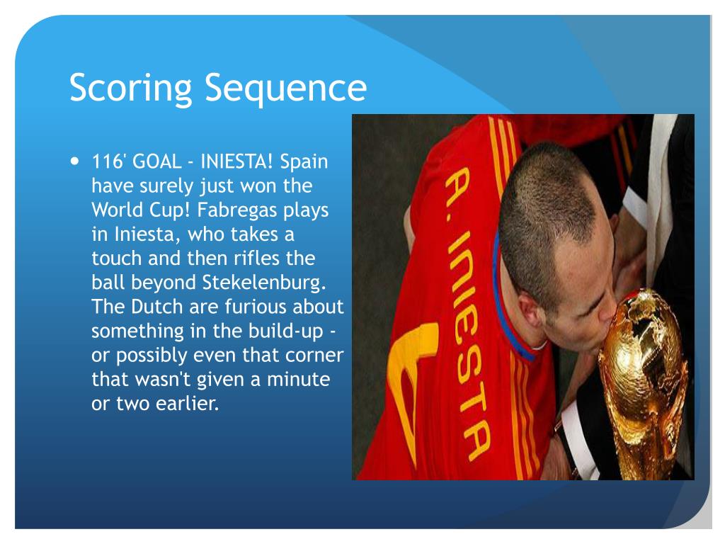 Scoring Sequence • 116' GOAL - INIESTA! Spain have surely just won the World Cup! Fabregas plays in Iniesta, who takes a touch and then rifles the ball beyond Stekelenburg. The Dutch are furious about something in the build-up - or possibly even that corner that wasn't given a minute or two earlier.
