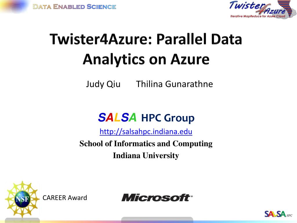 Twister4Azure: Parallel Data Analytics on Azure. Judy Qiu Thilina Gunarathne. S A L S A HPC Group http:// salsahpc.indiana.edu School of Informatics and Computing Indiana University. CAREER Award. Outline. Iterative Mapreduce Programming M odel Interoperability Reproducibility.
