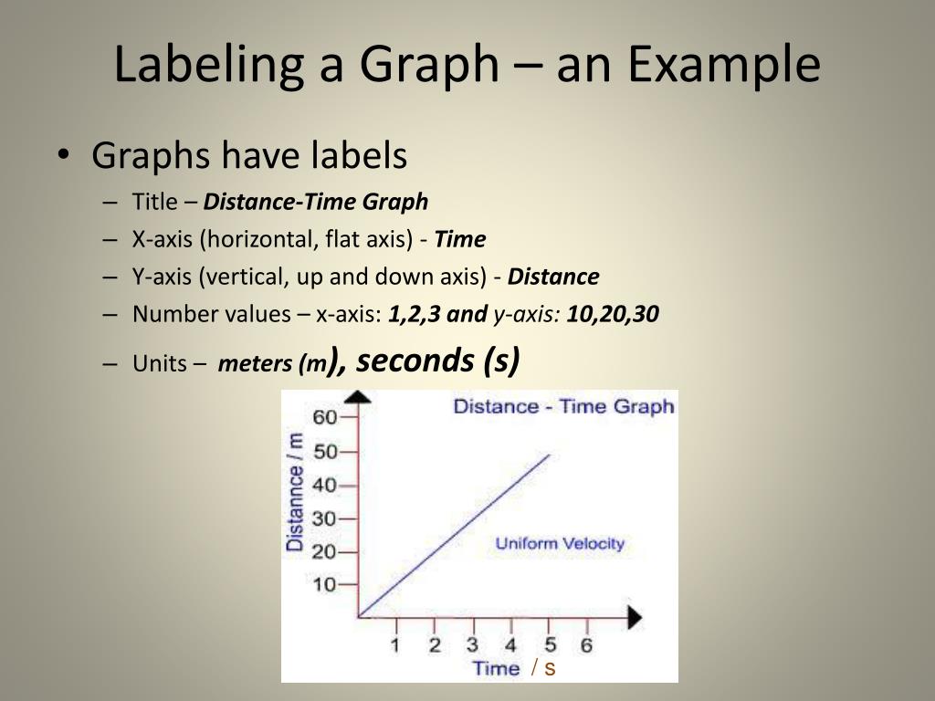 Labeling a Graph – an Example • Graphs have labels • Title – Distance-Time Graph • X-axis (horizontal, flat axis) - Time • Y-axis (vertical, up and down axis) - Distance • Number values – x-axis: 1,2,3 and y-axis: 10,20,30 • Units – meters (m), seconds (s) / s