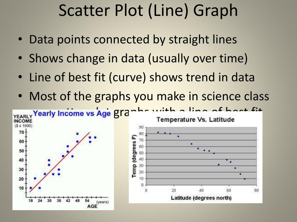 Scatter Plot (Line) Graph • Data points connected by straight lines • Shows change in data (usually over time) • Line of best fit (curve) shows trend in data • Most of the graphs you make in science class are scatter plot graphs with a line of best fit (curve)