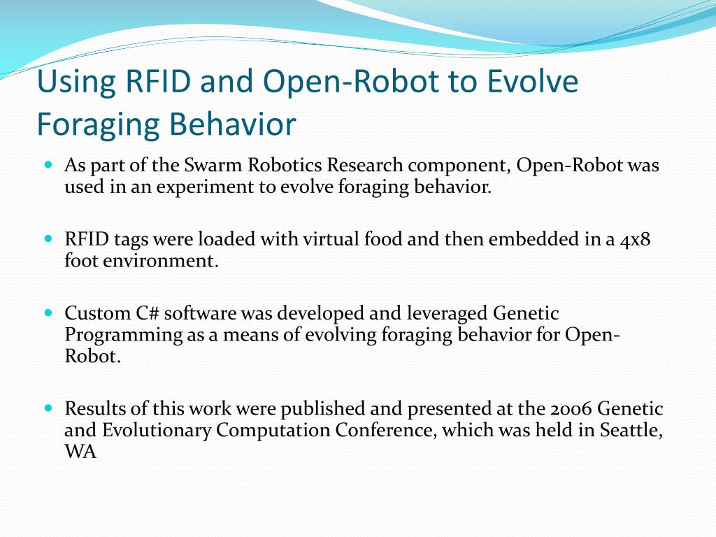Using RFID and Open-Robot to Evolve Foraging Behavior • As part of the Swarm Robotics Research component, Open-Robot was used in an experiment to evolve foraging behavior. • RFID tags were loaded with virtual food and then embedded in a 4x8 foot environment. • Custom C# software was developed and leveraged Genetic Programming as a means of evolving foraging behavior for Open-Robot. • Results of this work were published and presented at the 2006 Genetic and Evolutionary Computation Conference, which was held in Seattle, WA