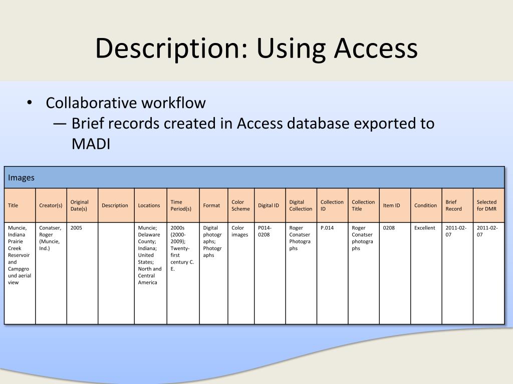 Description: Using Access • Collaborative workflow • Brief records created in Access database exported to MADI