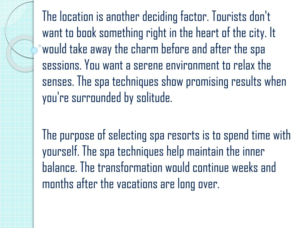 The location is another deciding factor. Tourists don't want to book something right in the heart of the city. It would take away the charm before and after the spa sessions. You want a serene environment to relax the senses. The spa techniques show promising results when you're surrounded by solitude. The purpose of selecting spa resorts is to spend time with yourself. The spa techniques help maintain the inner balance. The transformation would continue weeks and months after the vacations are long over.
