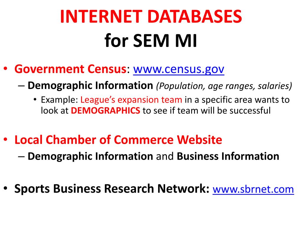 INTERNET DATABASES for SEM MI • Government Census: www.census.gov • Demographic Information (Population, age ranges, salaries) • Example: League’s expansion team in a specific area wants to look at DEMOGRAPHICS to see if team will be successful • Local Chamber of Commerce Website • Demographic Information and Business Information • Sports Business Research Network: www.sbrnet.com