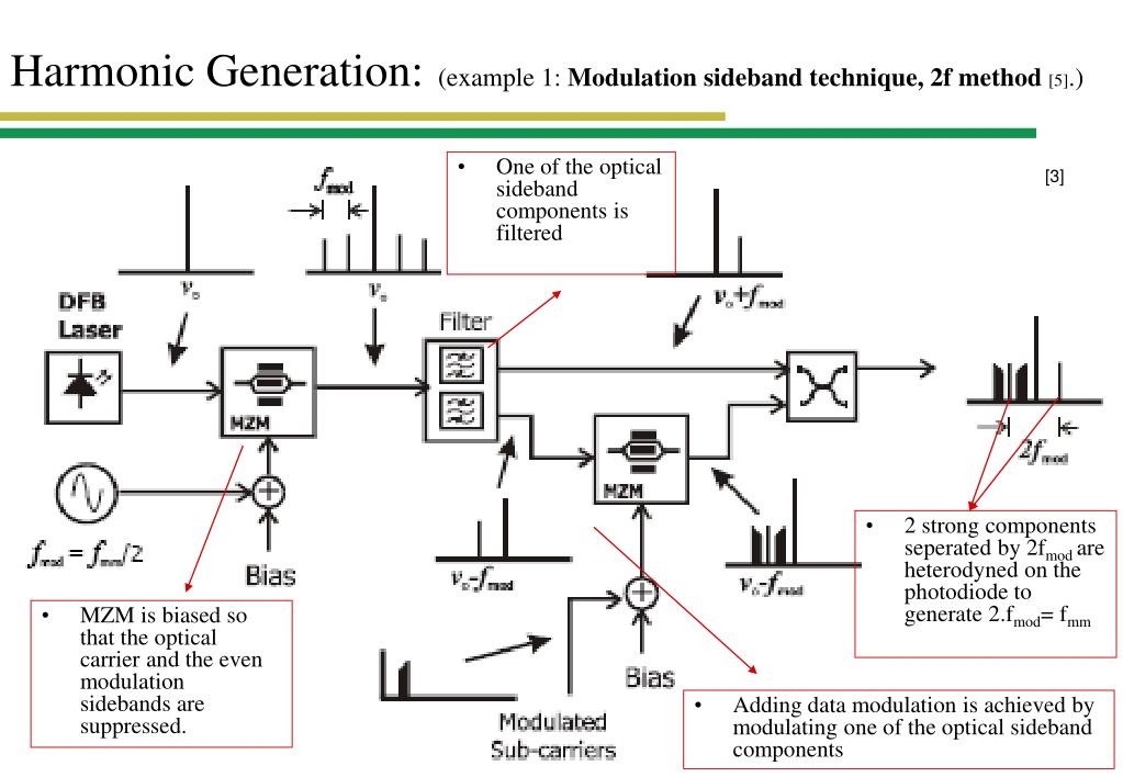 Harmonic Generation:(example 1: Modulation sideband technique, 2f method[5].) • One of the optical sideband components is filtered [3] • 2 strong components seperated by 2fmod are heterodyned on the photodiode to generate 2.fmod= fmm • MZM is biased so that the optical carrier and the even modulation sidebands are suppressed. • Adding data modulation is achieved by modulating one of the optical sideband components
