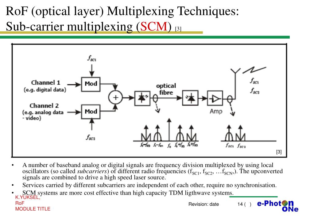 RoF (optical layer) Multiplexing Techniques: Sub-carrier multiplexing (SCM) [3] [3] • A number of baseband analog or digital signals are frequency division multiplexed by using local oscillators (so called subcarriers) of different radio frequencies (fSC1, fSC2, …fSCN,). The upconverted signals are combined to drive a high speed laser source. • Services carried by different subcarriers are independent of each other, require no synchronisation. • SCM systems are more cost effective than high capacity TDM ligthwave systems. K.YUKSEL, RoF MODULE TITLE