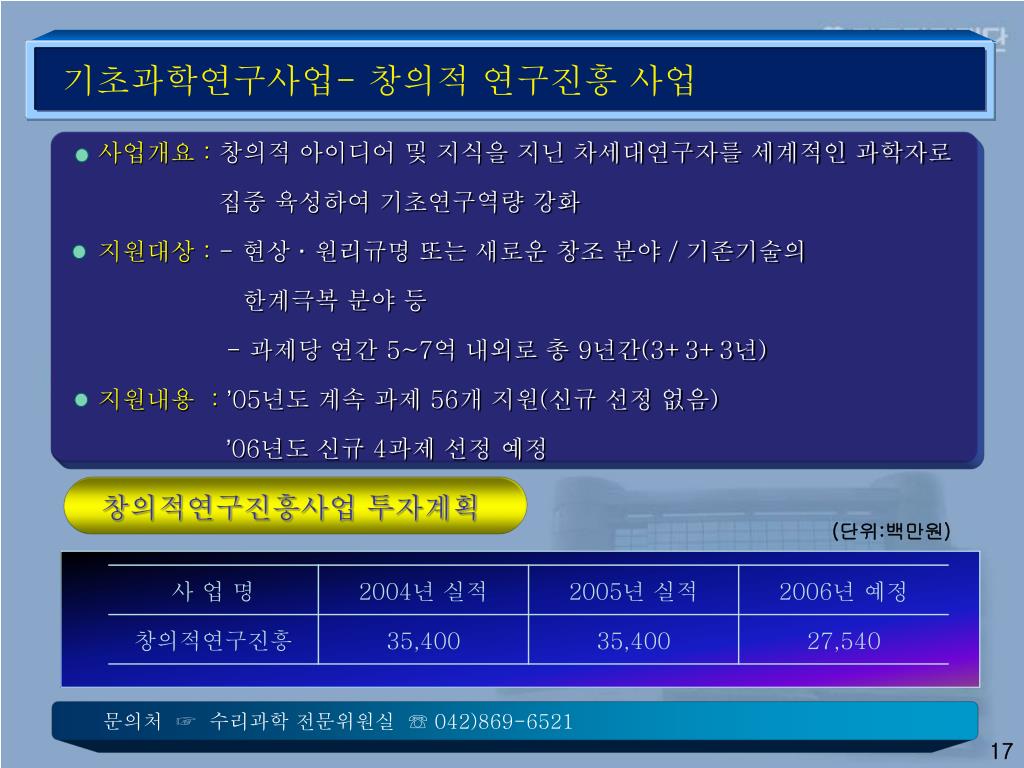 기초과학연구사업- 창의적 연구진흥 사업 사업개요 : 창의적 아이디어 및 지식을 지닌 차세대연구자를 세계적인 과학자로 집중 육성하여 기초연구역량 강화 지원대상 : - 현상 ·원리규명 또는 새로운 창조 분야 / 기존기술의 한계극복 분야 등 - 과제당 연간 5~7억 내외로 총 9년간(3+3+3년) 지원내용 : ’05년도 계속 과제 56개 지원(신규 선정 없음) ’06년도 신규 4과제 선정 예정 창의적연구진흥사업 투자계획 (단위:백만원) 문의처 ☞ 수리과학 전문위원실 ☏ 042)869-6521