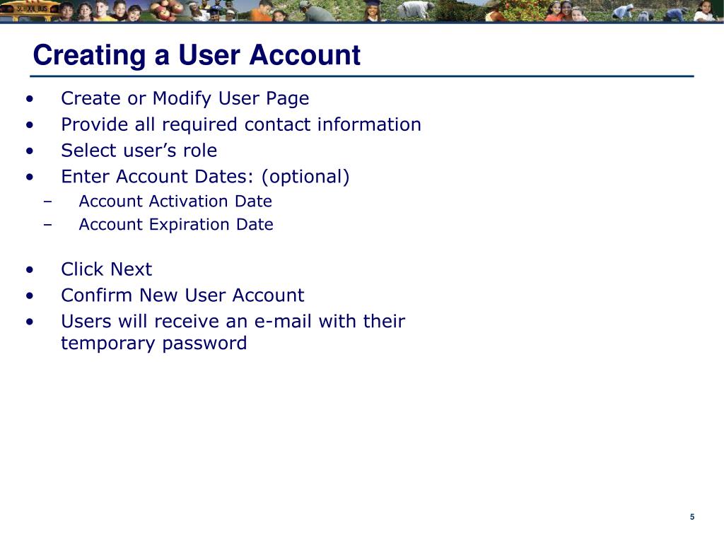 Creating a User Account • Create or Modify User Page • Provide all required contact information • Select user’s role • Enter Account Dates: (optional) • Account Activation Date • Account Expiration Date • Click Next • Confirm New User Account • Users will receive an e-mail with their temporary password