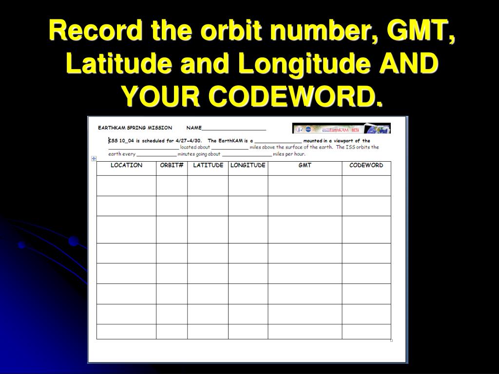 Record the orbit number, GMT, Latitude and Longitude AND YOUR CODEWORD.