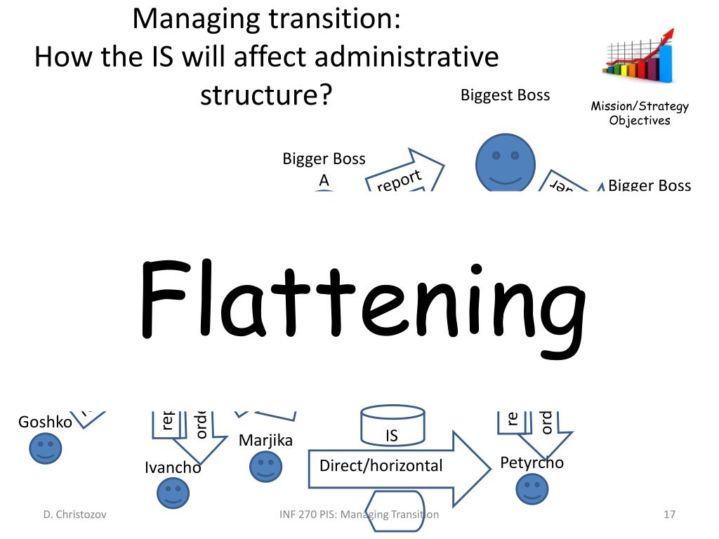 Managing transition:How the IS will affect administrative structure? Flattening Mission/Strategy Objectives report report report report report report report report order order order order order order order order Bigger Boss B Biggest Boss Big Boss Y Bigger Boss A Big Boss X Petyrcho Marjika Goshko Ivancho IS Direct/horizontal INF 270 PIS: Managing Transition