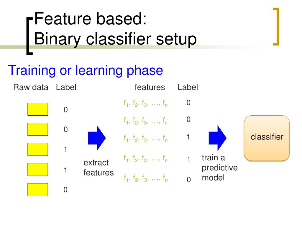 Feature based:Binary classifier setup Training or learning phase Raw data Label features Label f1, f2, f3, …, fn 0 0 0 f1, f2, f3, …, fn 0 classifier 1 f1, f2, f3, …, fn 1 train a predictive model f1, f2, f3, …, fn 1 extract features 1 f1, f2, f3, …, fn 0 0