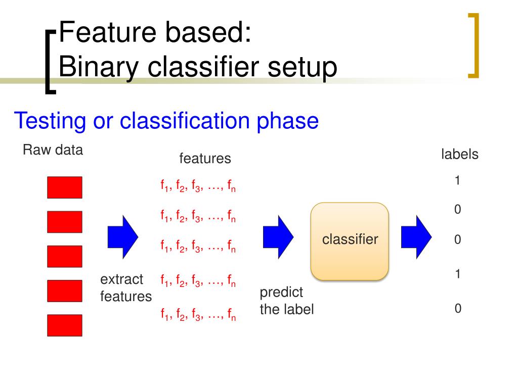 Feature based:Binary classifier setup Testing or classification phase Raw data labels features 1 f1, f2, f3, …, fn 0 f1, f2, f3, …, fn classifier 0 f1, f2, f3, …, fn 1 extract features f1, f2, f3, …, fn predict the label 0 f1, f2, f3, …, fn