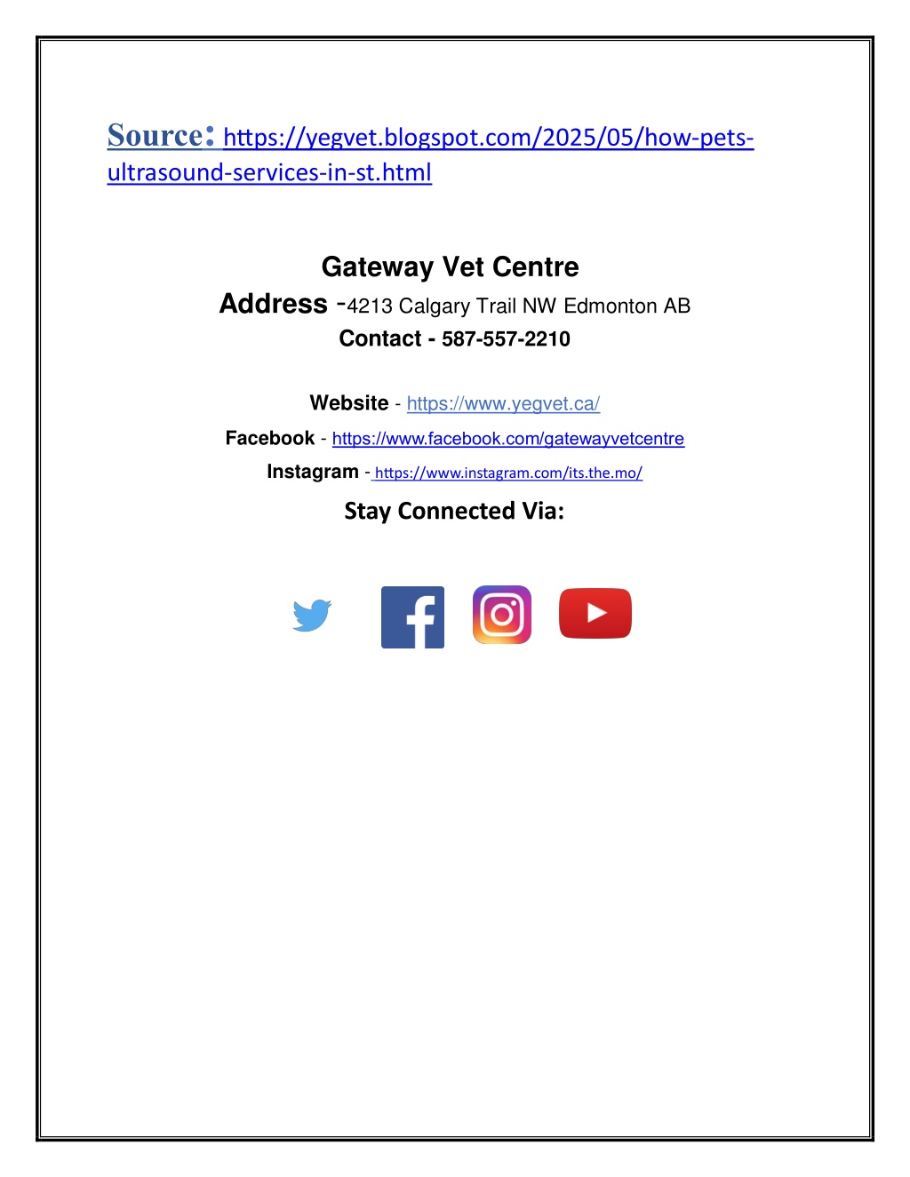 Source:https://yegvet.blogspot.com/2025/05/how-pets- ultrasound-services-in-st.html Gateway Vet Centre Address-4213 Calgary Trail NW Edmonton AB Contact - 587-557-2210 Website - https://www.yegvet.ca/ Facebook - https://www.facebook.com/gatewayvetcentre Instagram -https://www.instagram.com/its.the.mo/ Stay Connected Via: