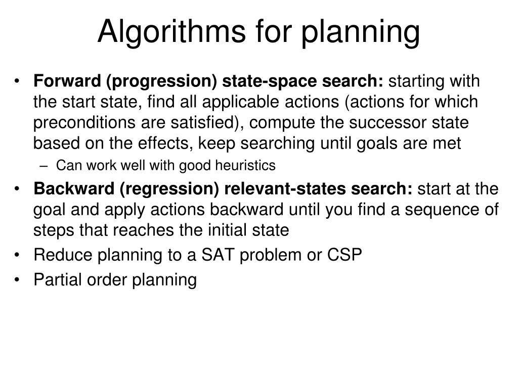 Algorithms for planning • Forward (progression) state-space search: starting with the start state, find all applicable actions (actions for which preconditions are satisfied), compute the successor state based on the effects, keep searching until goals are met • Can work well with good heuristics • Backward (regression) relevant-states search: start at the goal and apply actions backward until you find a sequence of steps that reaches the initial state • Reduce planning to a SAT problem or CSP • Partial order planning