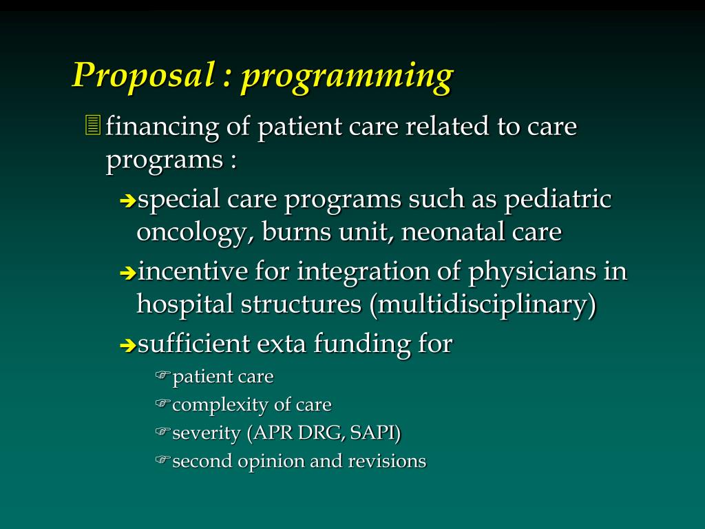 Proposal : programming • financing of patient care related to care programs : • special care programs such as pediatric oncology, burns unit, neonatal care • incentive for integration of physicians in hospital structures (multidisciplinary) • sufficient exta funding for • patient care • complexity of care • severity (APR DRG, SAPI) • second opinion and revisions