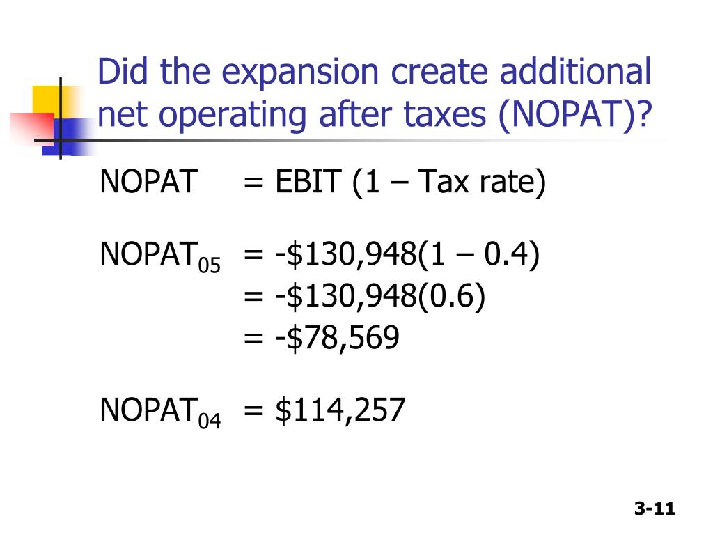 Did the expansion create additional net operating after taxes (NOPAT)? NOPAT = EBIT (1 – Tax rate) NOPAT05 = -$130,948(1 – 0.4) = -$130,948(0.6) = -$78,569 NOPAT04= $114,257