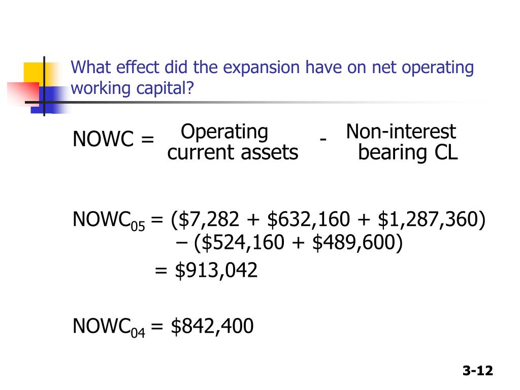 What effect did the expansion have on net operating working capital? NOWC = Operating - Non-interest current assets bearing CL NOWC05 = ($7,282 + $632,160 + $1,287,360) – ($524,160 + $489,600) = $913,042 NOWC04 = $842,400