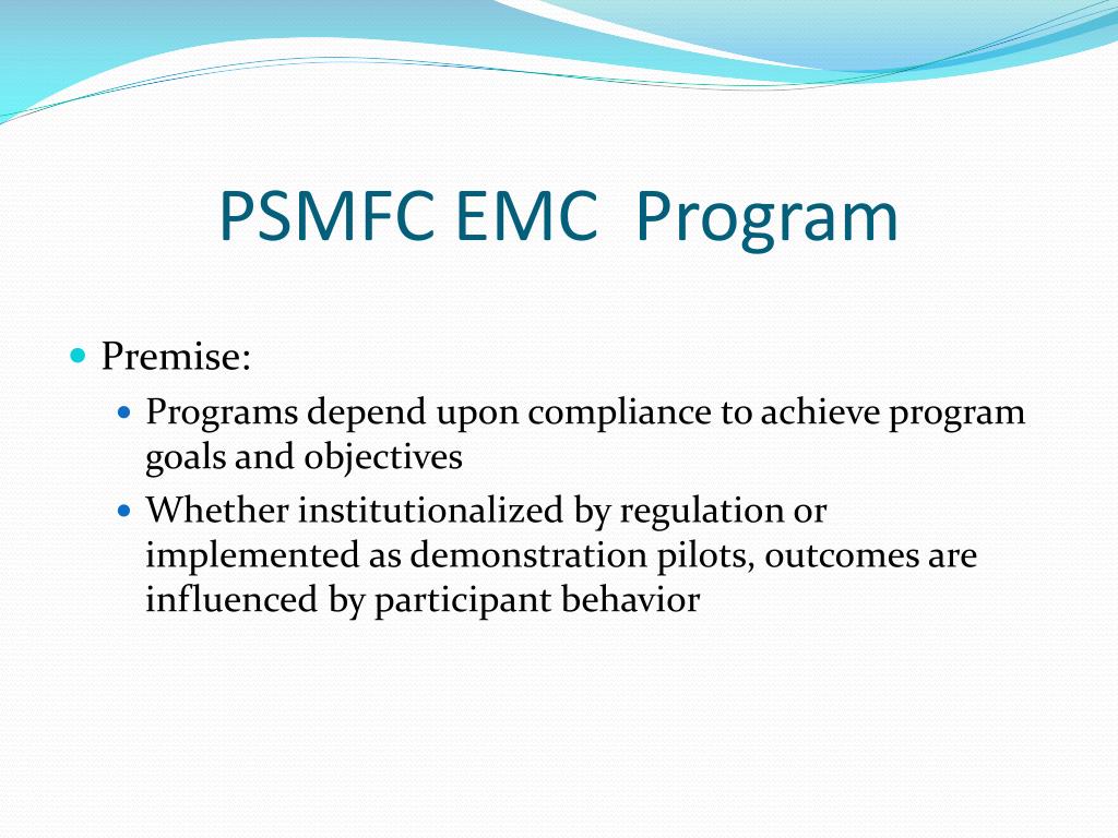PSMFC EMC Program • Premise: • Programs depend upon compliance to achieve program goals and objectives • Whether institutionalized by regulation or implemented as demonstration pilots, outcomes are influenced by participant behavior