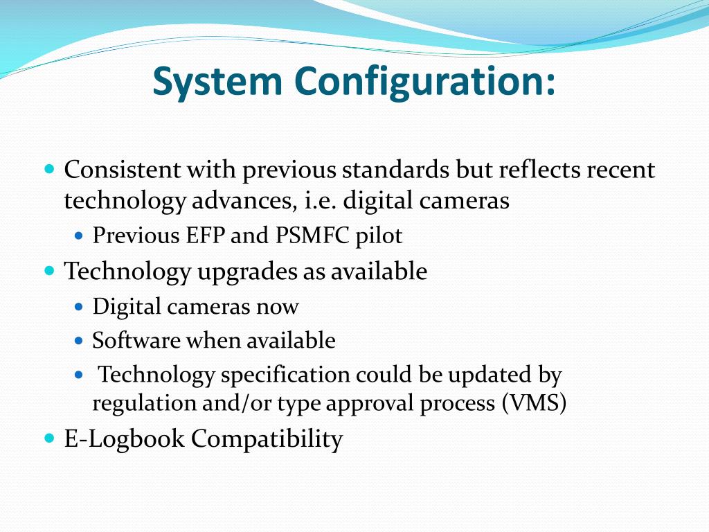 System Configuration: • Consistent with previous standards but reflects recent technology advances, i.e. digital cameras • Previous EFP and PSMFC pilot • Technology upgrades as available • Digital cameras now • Software when available • Technology specification could be updated by regulation and/or type approval process (VMS) • E-Logbook Compatibility