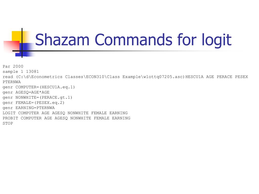 Shazam Commands for logit Par 2000 sample 1 13081 read (C:\d\Econometrics Classes\ECON310\Class Example\wlottq07205.asc)HESCU1A AGE PERACE PESEX PTERNWA genr COMPUTER=(HESCU1A.eq.1) genr AGESQ=AGE*AGE genr NONWHITE=(PERACE.gt.1) genr FEMALE=(PESEX.eq.2) genr EARNING=PTERNWA LOGIT COMPUTER AGE AGESQ NONWHITE FEMALE EARNING PROBIT COMPUTER AGE AGESQ NONWHITE FEMALE EARNING STOP
