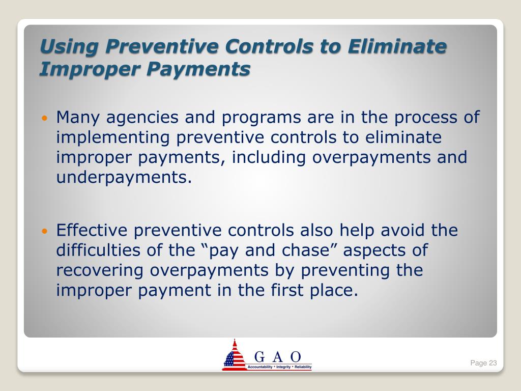 Many agencies and programs are in the process of implementing preventive controls to eliminate improper payments, including overpayments and underpayments. • Effective preventive controls also help avoid the difficulties of the “pay and chase” aspects of recovering overpayments by preventing the improper payment in the first place. Using Preventive Controls to Eliminate Improper Payments